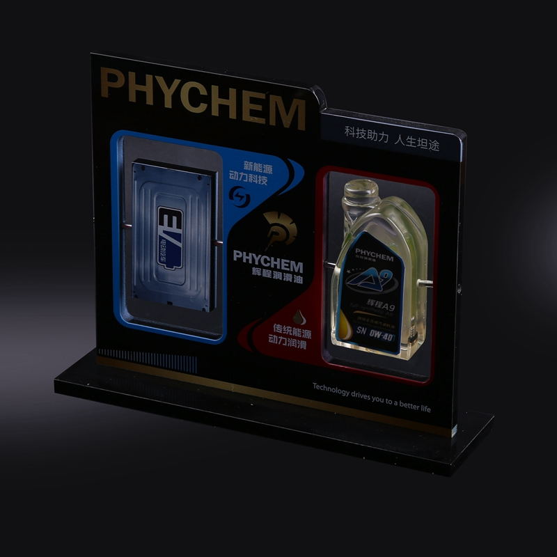 產品描述:亞克力機油展示架,采用透光性高達96%的亞克力為原材料,清晰、透亮,顧客通過內置的鐵球,能夠清晰直觀的觀察機油色澤以及潤滑程度,我們也可以為您定制各類的形狀以及圖案(Logo、二維碼等),向客戶全方位的展示您的公司或個人信息。